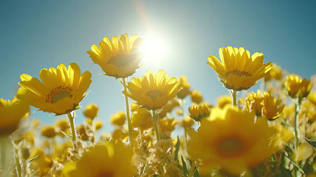 A stunning close-up of vibrant yellow flowers basking in bright sunlight against a clear blue sky, showcasing the beauty of nature in a cheerful spring scene.