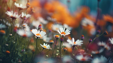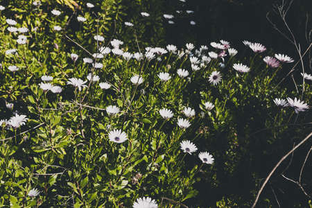 Tranquil scene of white daisies with a moody, vintage filter in a meadow at twilight