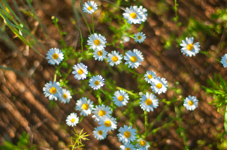 Chamomile field flowers border. Beautiful nature scene with blooming medical chamomilles in sun flare. Alternative medicine Spring Daisy. Summer flowers. Beautiful meadow. Summer background