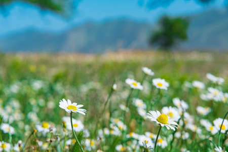 Many white beautiful flowers of daisies. Flowering plants in spring and summer