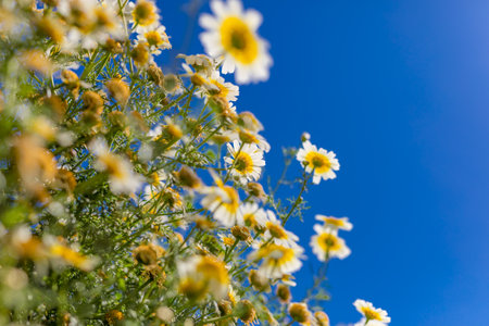 Chamomile flowers on the background of the blue sky. White daisies on blue sky background. Beautiful Idyllic nature closeup, spring summer meadow flowers under sunny weather