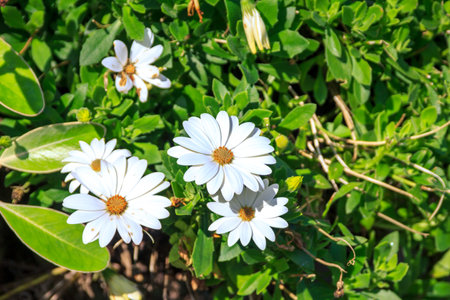 Bright white daisies bloom amidst lush green foliage, their delicate petals radiating under the warm sunlight, creating a vibrant and serene natural scene that embodies the beauty of spring