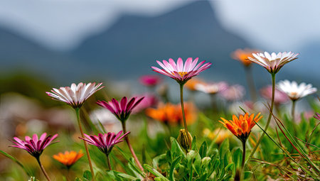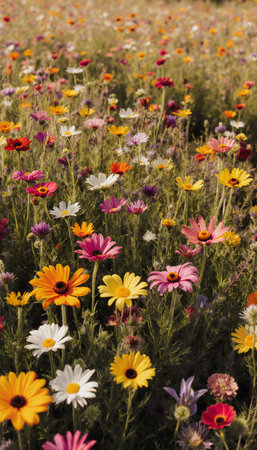 A captivating image of vibrant blossoms showcasing an array of colors in a lush meadow, surrounded by soft greenery, celebrating nature's beauty.