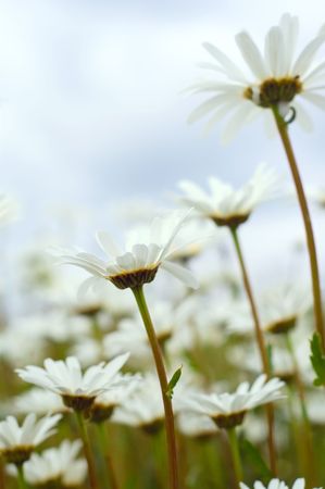 Focus at one single daisy flower in a flowers bed with lot of daisies