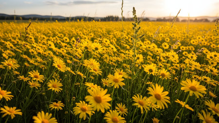 A vibrant field of yellow daisy flowers bathed in the warm glow of a golden sunset. The scenic meadow landscape conveys peace, nature's beauty, and the warmth of summer.