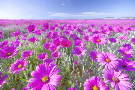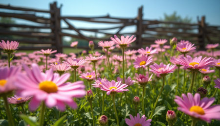 A lush field of pink daisies stretches towards a rustic wooden fence under a clear blue sky. The scene radiates joy and tranquility, inviting viewers to immerse themselves in the beauty of natures vibrant colors.