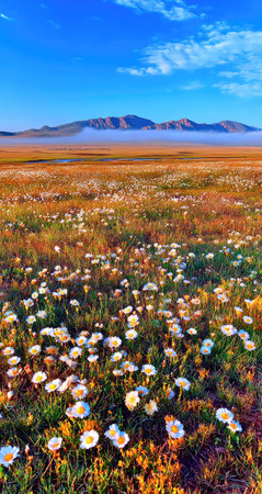 Picturesque landscape of a meadow filled with wildflowers of various colors, extending to a distant mountain range. A soft mist hangs over the plains in the distance. The sky is a vibrant blue, dotted with soft white clouds.