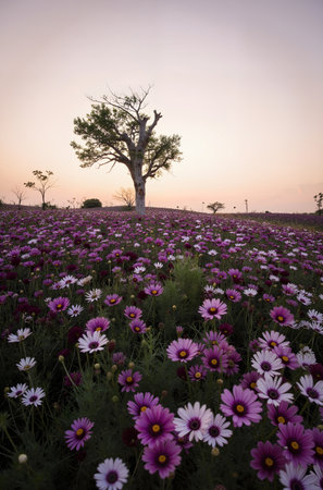 Cosmos flower field with tree in the morning at Chiang Mai, Thailand