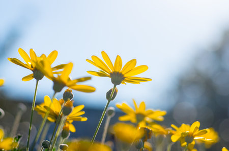 Bright yellow blooms dance in the gentle breeze, filling the garden with life and color. Sunlight filters through the petals, creating a warm and inviting atmosphere on this beautiful day.