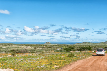 WEST COAST NATIONAL PARK, SOUTH AFRICA, AUGUST 20, 2018: Wild flowers at Postberg near Langebaan on the Atlantic Ocean coast in the Western Cape Province. Vehicles are visible