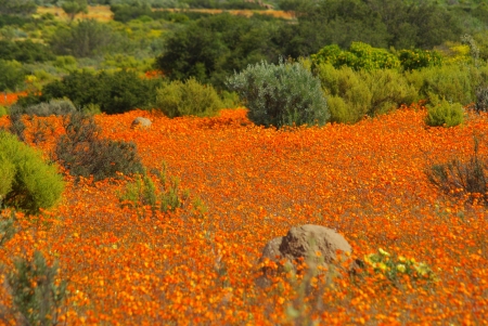 Patches of orange wild flowers as far as the eye can see. Namaqualand, South Africa