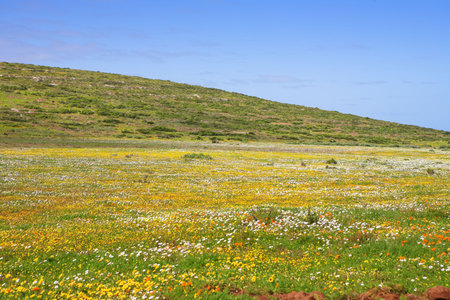 Flowers in dessert during spring season in Western Coast National Park, South Africa - focus on the hill