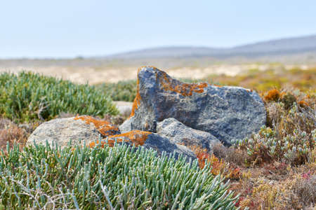 Fynbos plants growing in remote landscape around granite rock in Cape Town, South Africa. Scenic view of detailed environment and copyspace background. Nature reserve of indigenous succulents