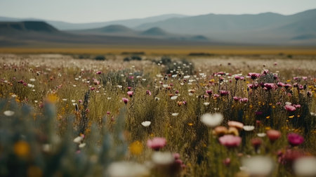 Fields of vibrant wildflowers stretching towards majestic mountains under a bright sky