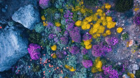 This stunning aerial view showcases a vibrant array of wildflowers in full bloom, complemented by rugged rocks, creating a beautiful natural landscape.