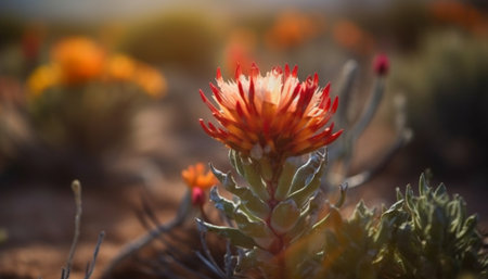 Close up of a red flower in the middle of a desert landscape