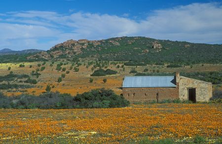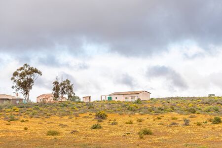 NARIEP, SOUTH AFRICA - AUGUST 15, 2015: A farm house in a sea of wild flowers on the road to Groenrivier green river on the Northern Cape Atlantic coast of South Africa