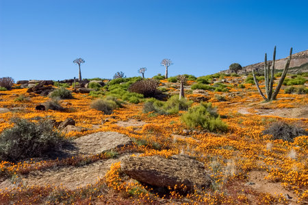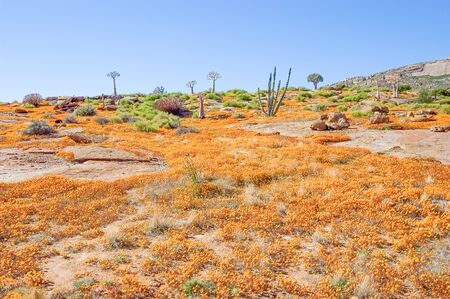 Quiver trees and a sea of orange daisies on the slopes of a hill in Nababeep, a small mining town in the Northern Cape Namaqualand