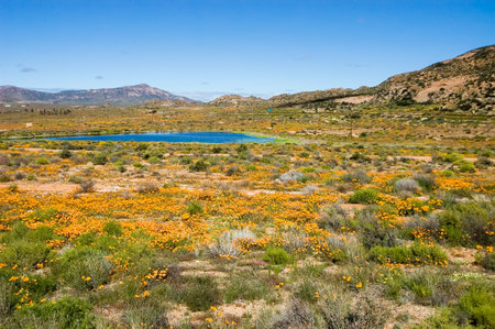 A dam and wild flowers near the town of Springbok, in the Northern Cape Namaqualand