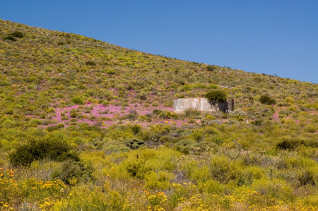 GROENRIVIER, SOUTH AFRICA - AUGUST 15, 2015: A farm house in a sea of wild flowers on the road to Groenrivier green river on the Northern Cape Atlantic coast of South Africa