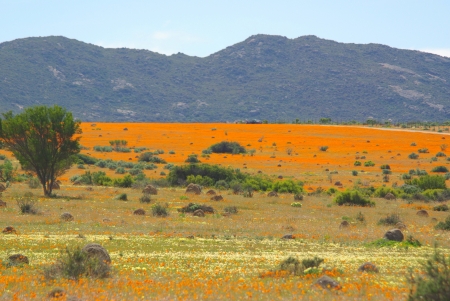 A sea of orange daisies on the slopes of a hill in Nababeep, a small mining town in the Northern Cape Namaqualand
