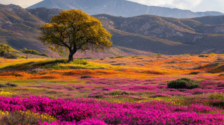 A breathtaking view of colorful wildflowers blanketing a meadow with a lone tree standing proudly under a bright blue sky, surrounded by distant mountains during springtime.