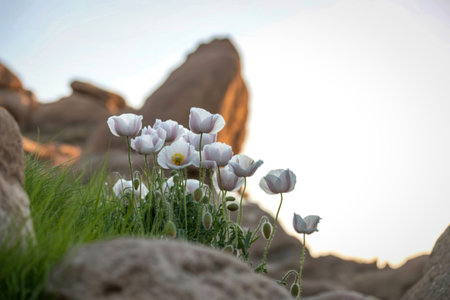 Delicate white poppies blooming among desert rocks