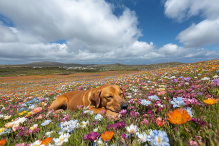 A golden retriever lies contently among colorful wildflowers in a scenic countryside field under a bright blue sky with fluffy clouds. Nature surrounds this tranquil setting.