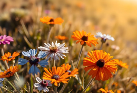 Colorful flowers bloom in a field, capturing the sunlight against a vivid blue sky, creating a cheerful and lively scene.