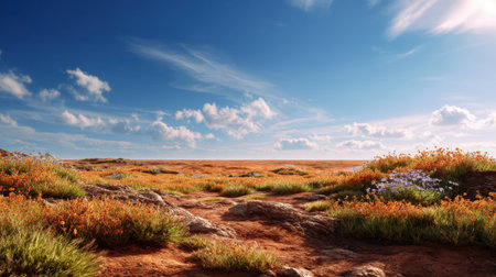 A wide, arid landscape stretches towards the horizon under a vibrant blue sky dotted with fluffy white clouds. The foreground is characterized by reddish-brown earth, scattered rocks, and patches of dry grass interspersed with small, colorful wildflowers in shades of orange and purple. The scene evokes a sense of vastness and natural beauty in a remote, sun-drenched environment.