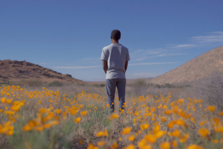 Young man stands in a field of blooming wildflowers, admiring the beauty of the desert landscape