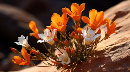 black canyon dhb wildflowers are captured in stunning close-up shots, showcasing delicate flowers in the style of light orange and white. these realistic still lifes feature dramatic lighting, creating contrasting shadows that add depth to the images. with a desertwave aesthetic, the light orange and silver tones create a captivating visual experience. ai generated