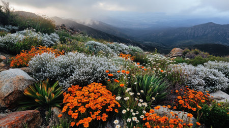Wild flowers on a slope with a mountain backdrop, at Goegap Nature Reserve near the town of Springbok