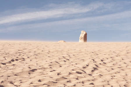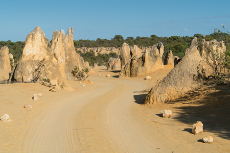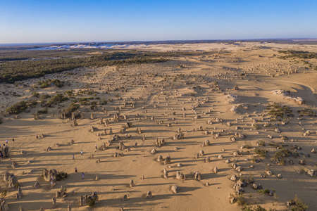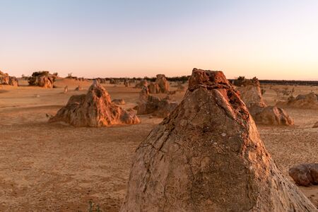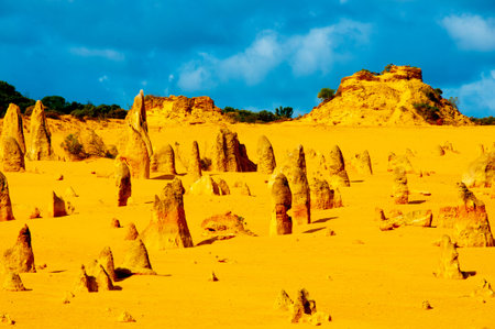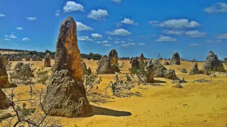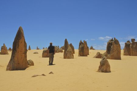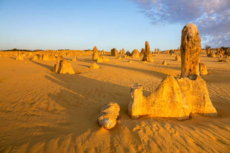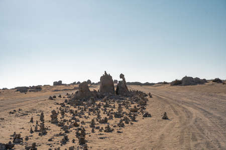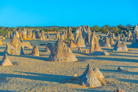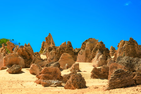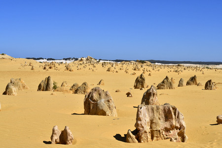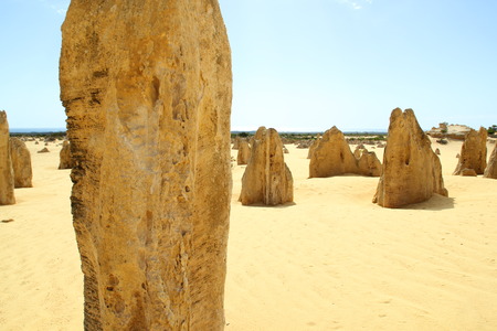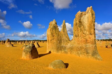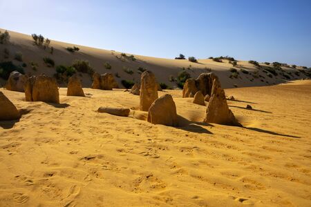 Scenic limestone rock formation Pinnacles in remote outback sandy desert of Nambung National Park, Western Australia, north of state capital Perth, summer sunny blue sky.