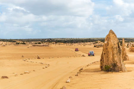 Cervantes, Nov 2019: Vintage cars driving on dirty and sandy desert road in the Pinnacles Desert, Nambung National Park, Western Australia