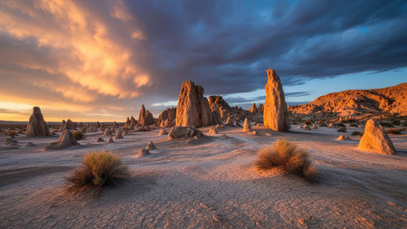 A scenic view of sandstone formation in the Pinnacles, Western Australia on a cloudy day