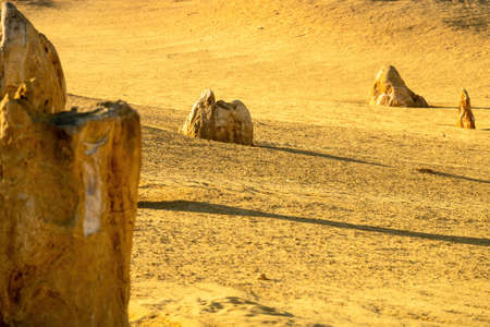 The Pinnacles Desert (Nambung National Park, Cervantes, Western Australia). Giant limestone pillars. Pinnacles rising steeply out of the desert