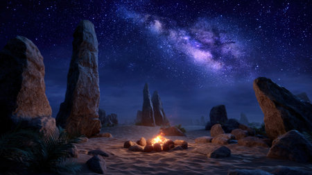 A warm campfire glows in a circle of stones on a sandy desert floor, illuminated by the breathtaking spectacle of the Milky Way galaxy stretching across the dark night sky. Tall, ancient rock formations stand sentinel in the landscape, adding a sense of mystery and timelessness to the scene. The overall atmosphere is one of profound peace and solitude, inviting contemplation under the vast, star-filled expanse.