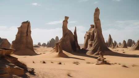 A surreal desert landscape at sunrise towering tufa rock formations casting long shadows across a misty, golden-lit terrain under a soft sky.
