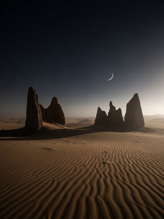 Desert landscape with jagged rock formations and rippled sand dunes under a crescent moon and starry night sky.