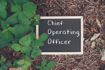 Chalkboard sign features Chief Operating Officer title, surrounded by lush green plants and earthy textures, representing leadership and corporate success in a tranquil setting