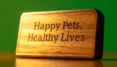 A beautifully crafted wooden plaque displays the heartfelt motto Happy Pets, Healthy Lives. Set against a vibrant green background, the warm lighting highlights the natural wood grain, creating a sense of trust, care, and professional commitment to animal well-being.