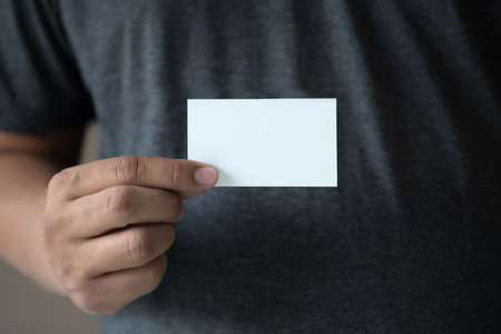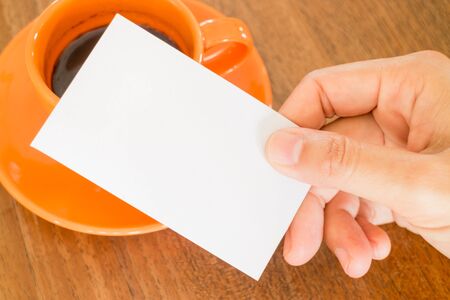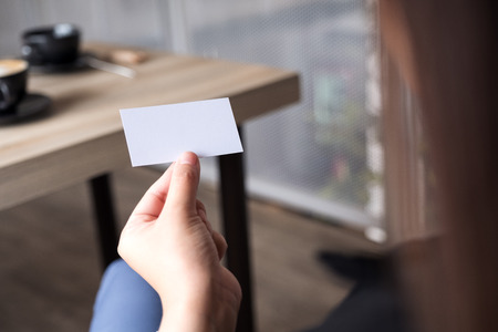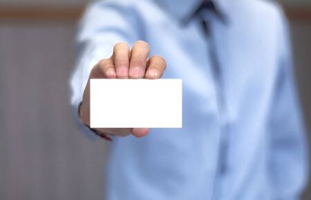 Blank business card mock up in hand on blurre office desk background use us contact information design templete.