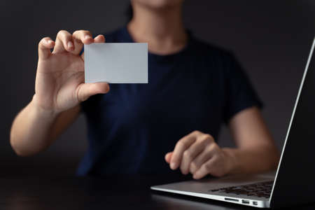 Man's hand holding blank Black Business Card. Modern Laptop on background, mockup