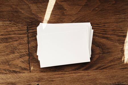 Three blank business cards against a wooden background. White paper rectangles lie on top of old cracked boards. selective focus.