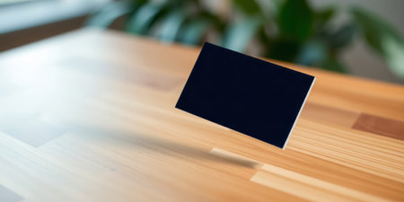 Close up of black blank illuminated by daylight business cards set on wooden table, 3d rendering.