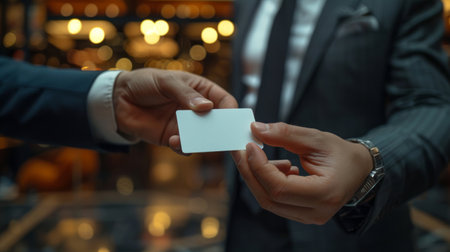 A woman gives another woman a business card. A close-up of two hands and a white card with room for text.