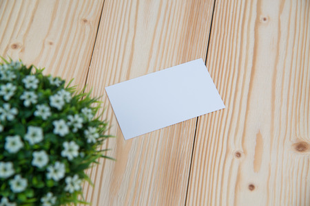 Blank business cards and little decorative tree in white vase on wooden working table with copy space for add text ID. and logo, business company concept idea.