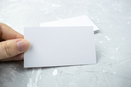 ockup of a business cards placed horizontal on a gray background. Hand holding white card on grunge background, concrete. Top of view