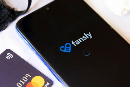Carrara, Italy - August 27, 2021 - Smatphone with a black lace bra and a credit card on the background, shows the Fansly logo.